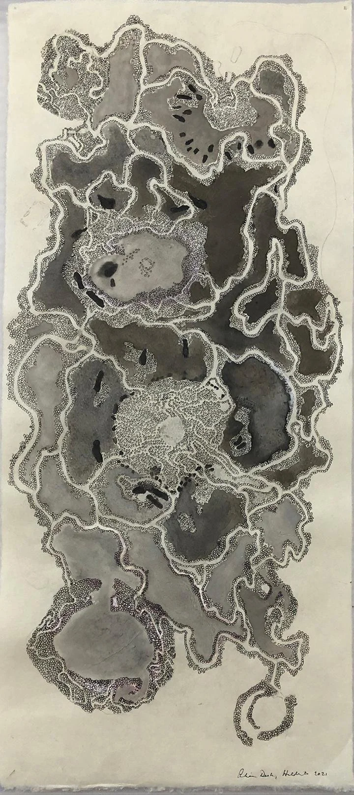 A similar palette and visual sensibility are immediately apparent, but their kinship runs much deeper. Hildreth describes her work in the show as focused on interconnectedness, how our choices “affect[} the fabric of an intricate and connected environment.” Similarly, Hunter uses everyday objects because they “speak a common language of utility, community and heritage.” As she states, “Nothing less than our shared humanity can be seen in a simple spoon.” Hall, through his depictions of our shared landscape, does not seek merely to reflect the beauty of that landscape, but to find “Beauty with a capital B.” Because, as Hall explains, “Beauty by its very nature implies integration, resolution of conflict, empathy, and love.”